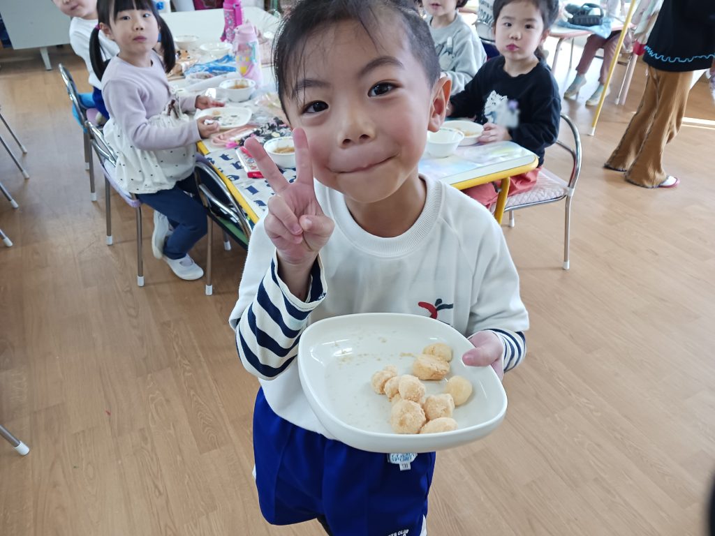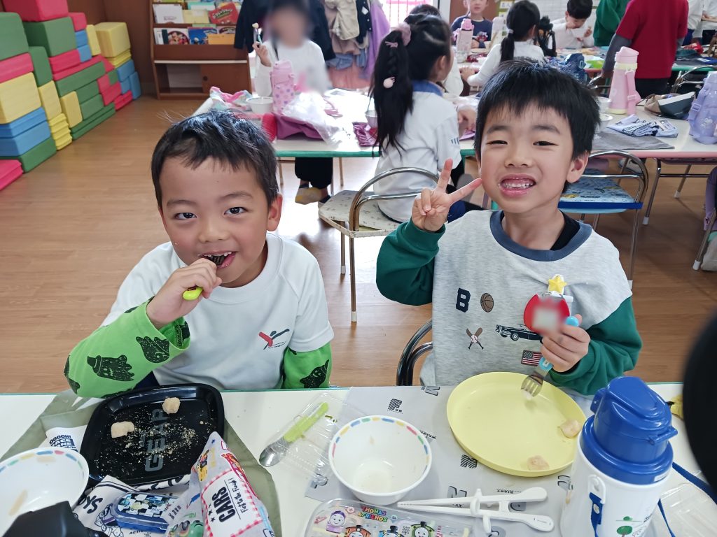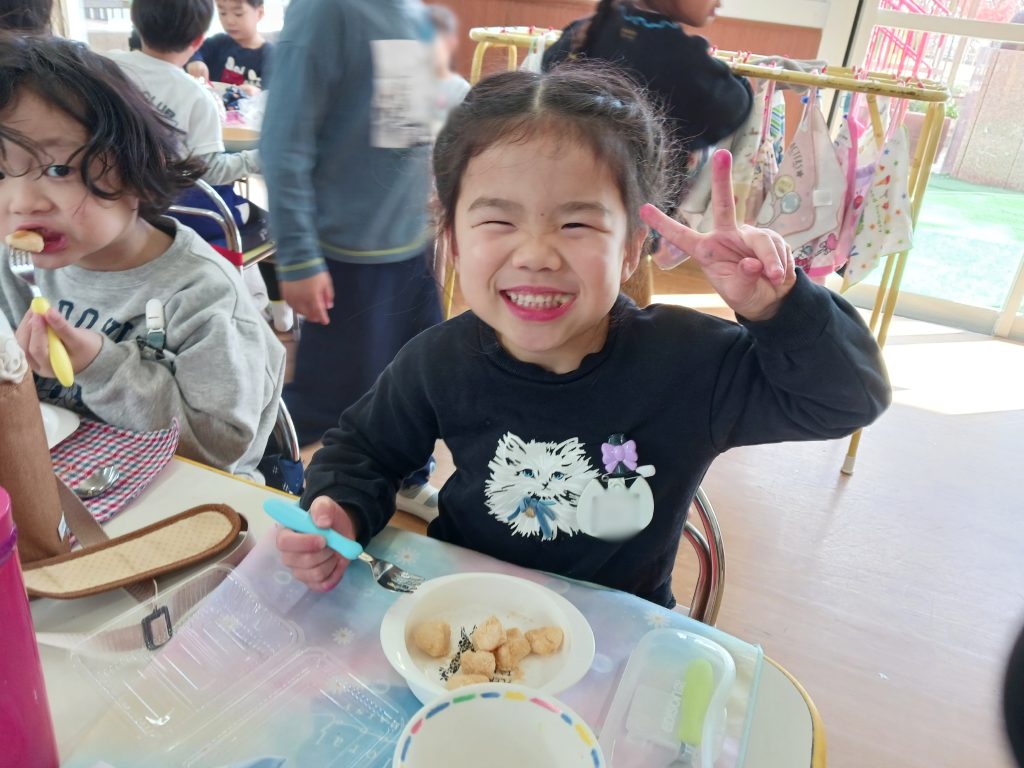 ふっくら蒸しあがったもち米が、ぺったんぺったんとつかれてお餅になっていく様子を間近で見て、子どもたちは「ごはんが変身した!」と驚いたり感心したりしていました。 実際に見て・触れて・味わうことで、食べものができるまでの過程を学ぶ貴重な体験となり、食育にもつながる一日となりました。