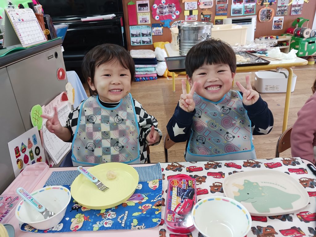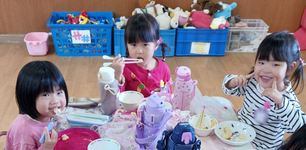 つきたてのおもちはモチモチで、あたたかくて、とってもおいしい! 「10コ食べたよ!」「おかわりー!」と、何度もおかわりをする姿も見られ、みんな大満足の様子でした。