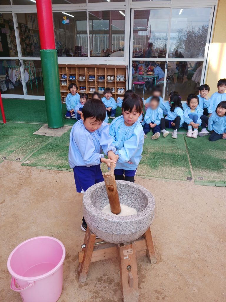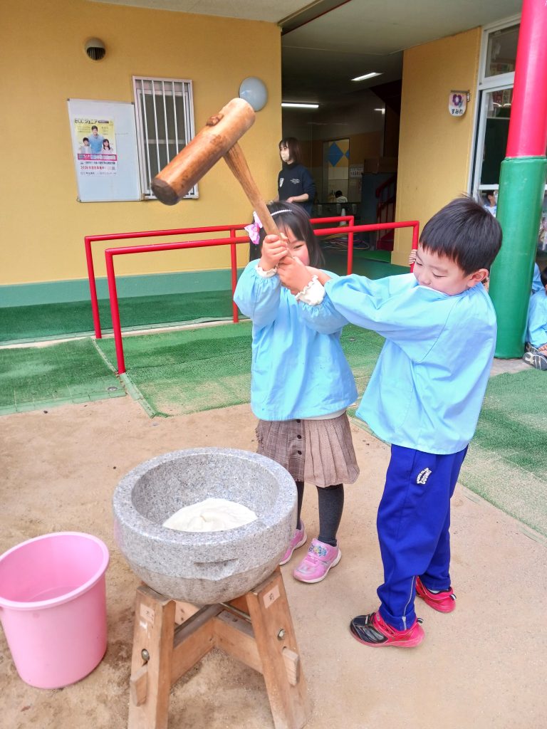 「よいしょ!ぺったん!」「よいしょ!ぺったん!」 杵を持つ手にも力が入り、年少さん・いちご組さんは初めてのおもちつきにドキドキしながらも一生懸命挑戦! 年長さんはさすがの貫禄で、慣れた手つきで力強くおもちをついてくれました。