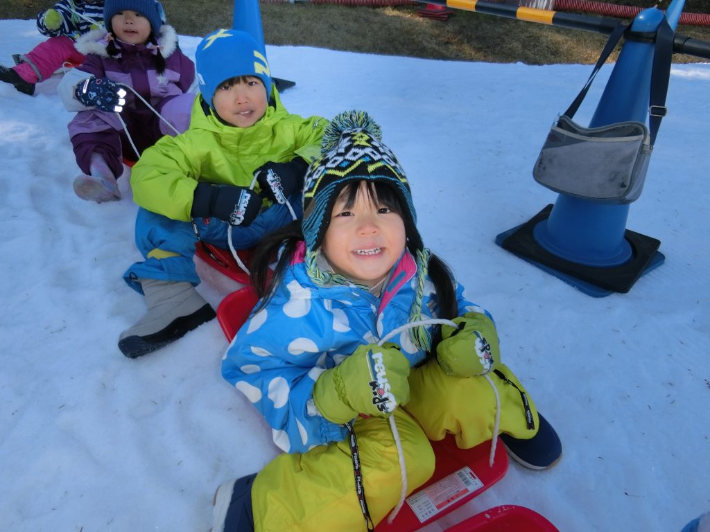そり遊びでは、何度も何度も滑っては「もう一回!」と元気いっぱい。お友達と一緒に乗ってスピードを楽しんだり、転んで雪まみれになって大笑いしたり…。雪の感触や冷たさを全身で感じながら思いきり遊びました。